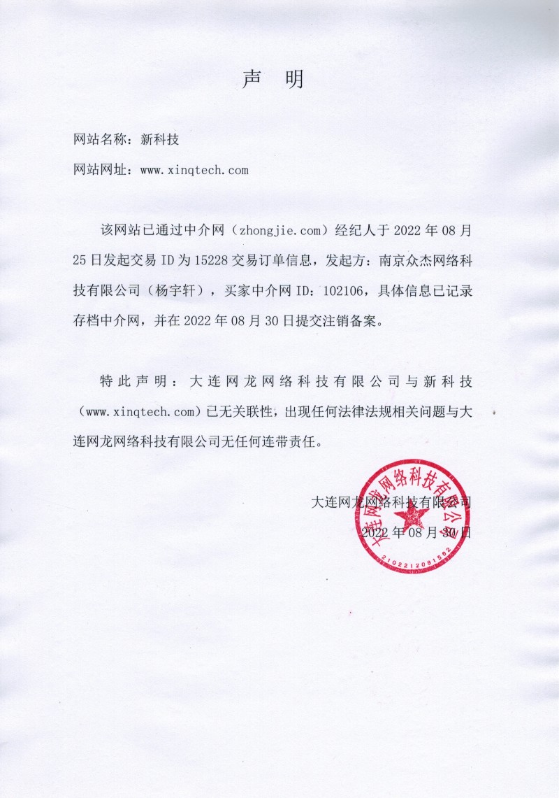 該網站(zhàn)已通(tōng)過中介網經紀人(rén)于2022年06月08日發起交易ID為(wèi)15228交易訂單信息,發起方:南京衆傑網絡科技(jì)有(yǒu)限公司(楊宇軒),買家(jiā)中介網ID:102106,具體(tǐ)信息已記錄存檔中介網,并在2022年06月10日提交注銷備案。